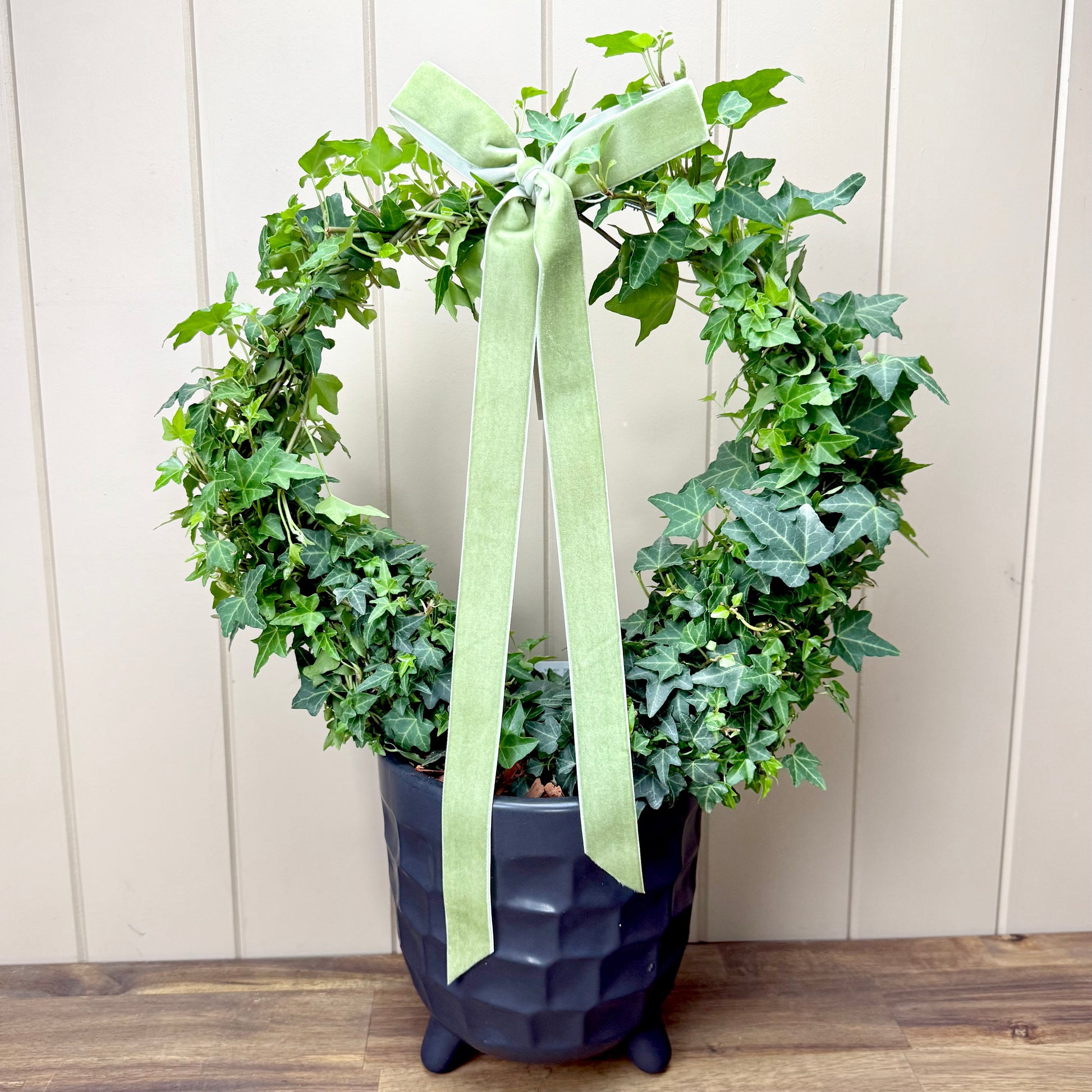 A lovely ivy plant potted in a decorative ceramic container (Olivia pot) and trained up onto a circle- shaped frame.