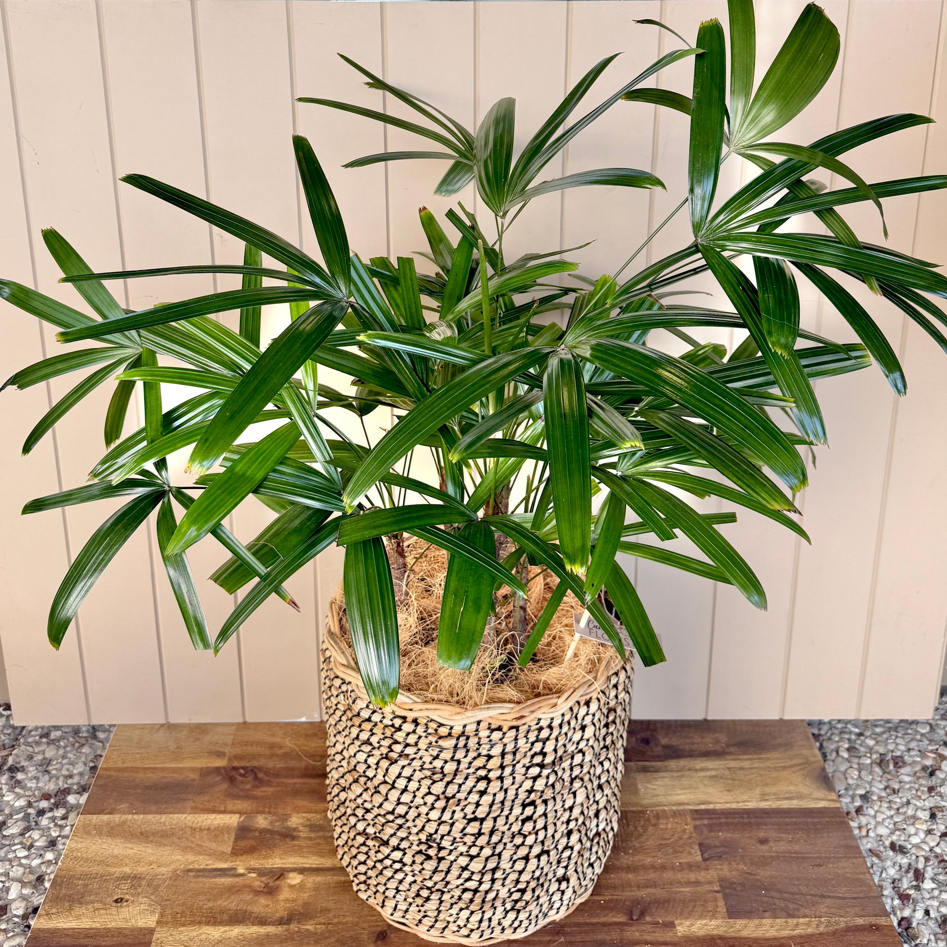 A lovely palm plant with fan-shaped leaves. Presented in a large woven basket.