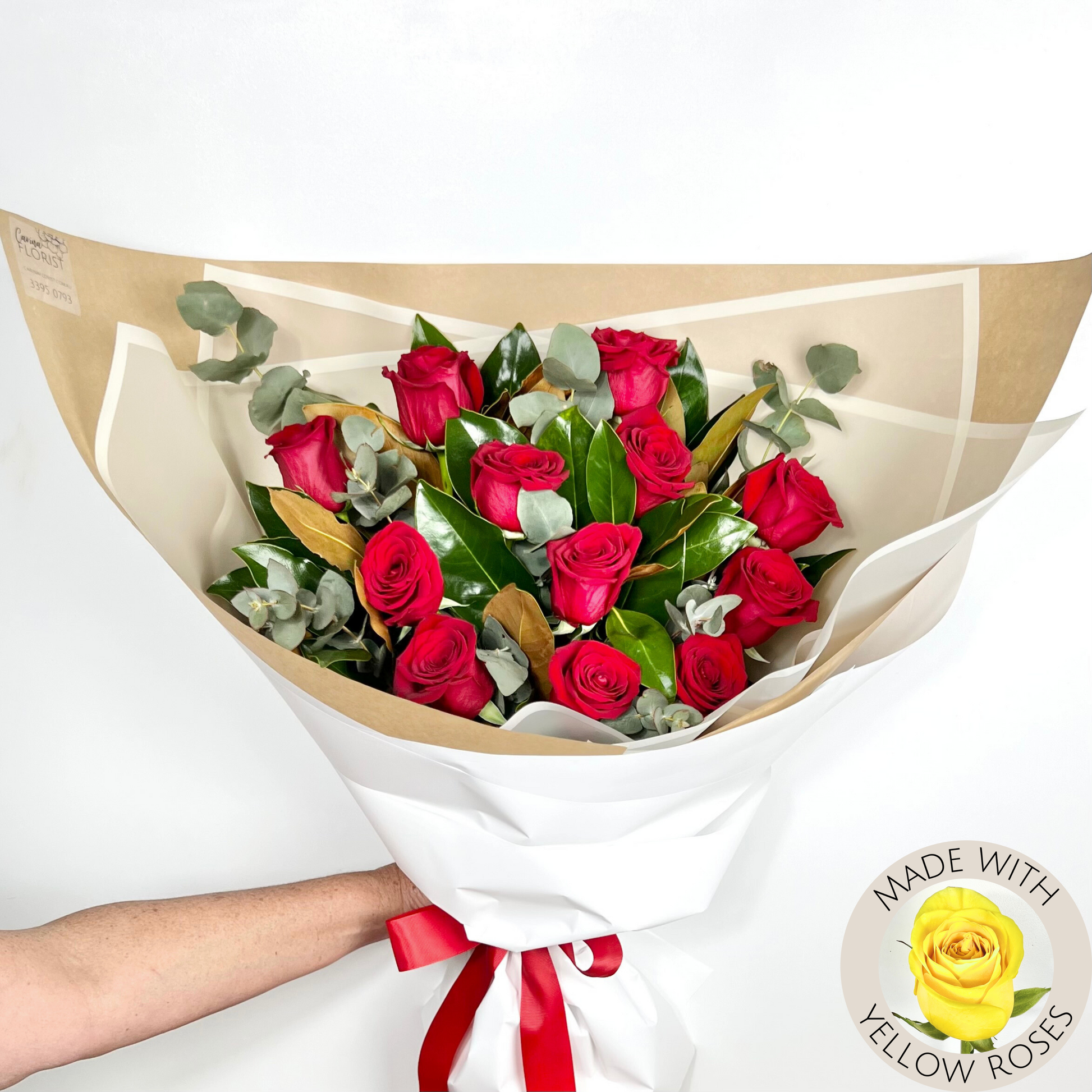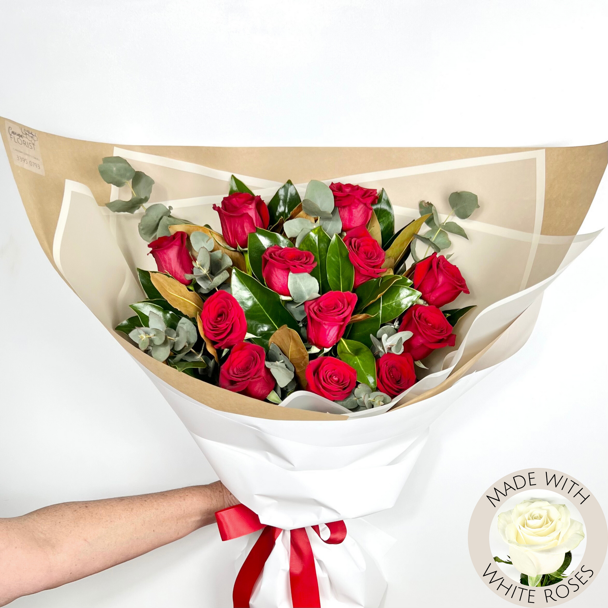 Show love with classic, beautiful roses, framed with seasonal greenery.