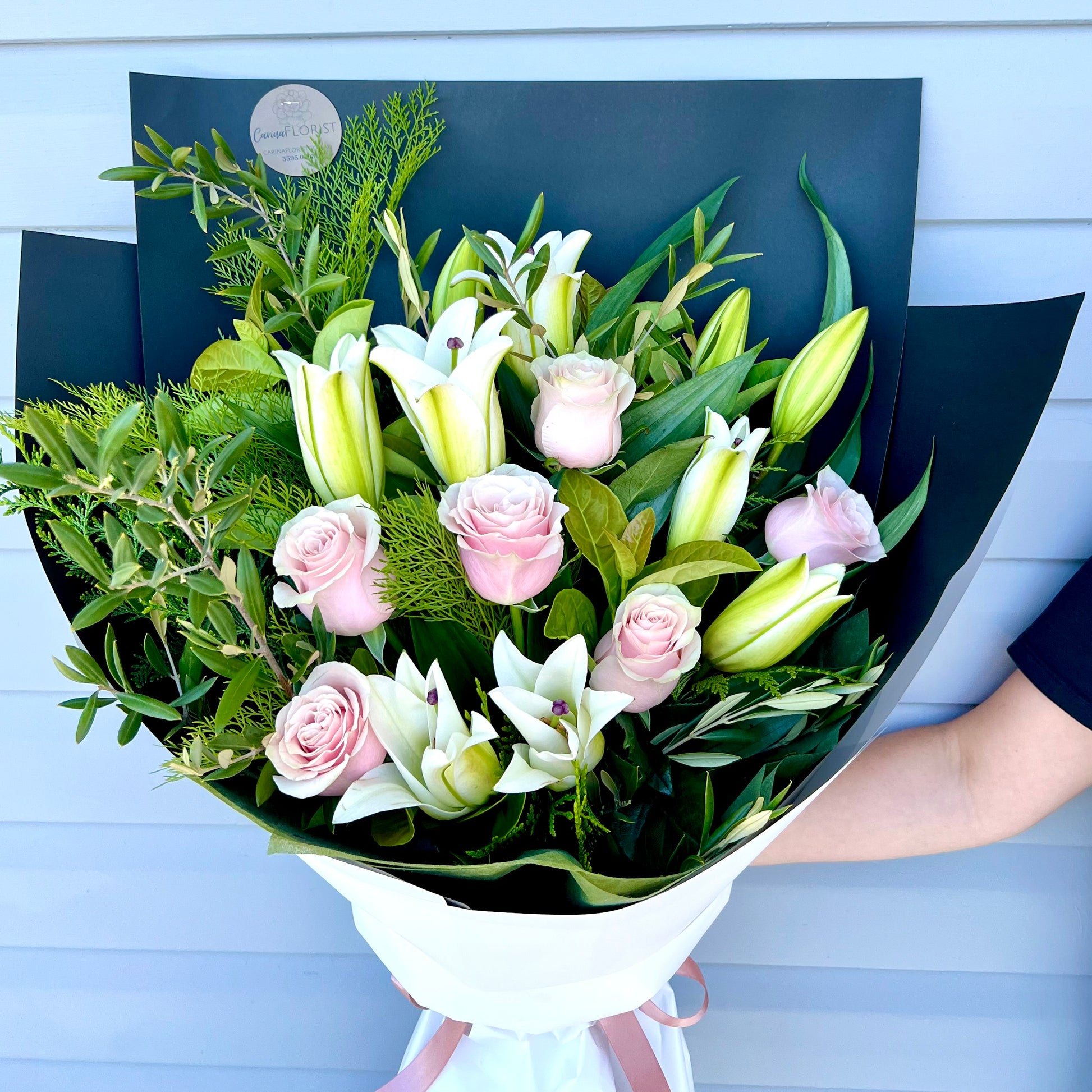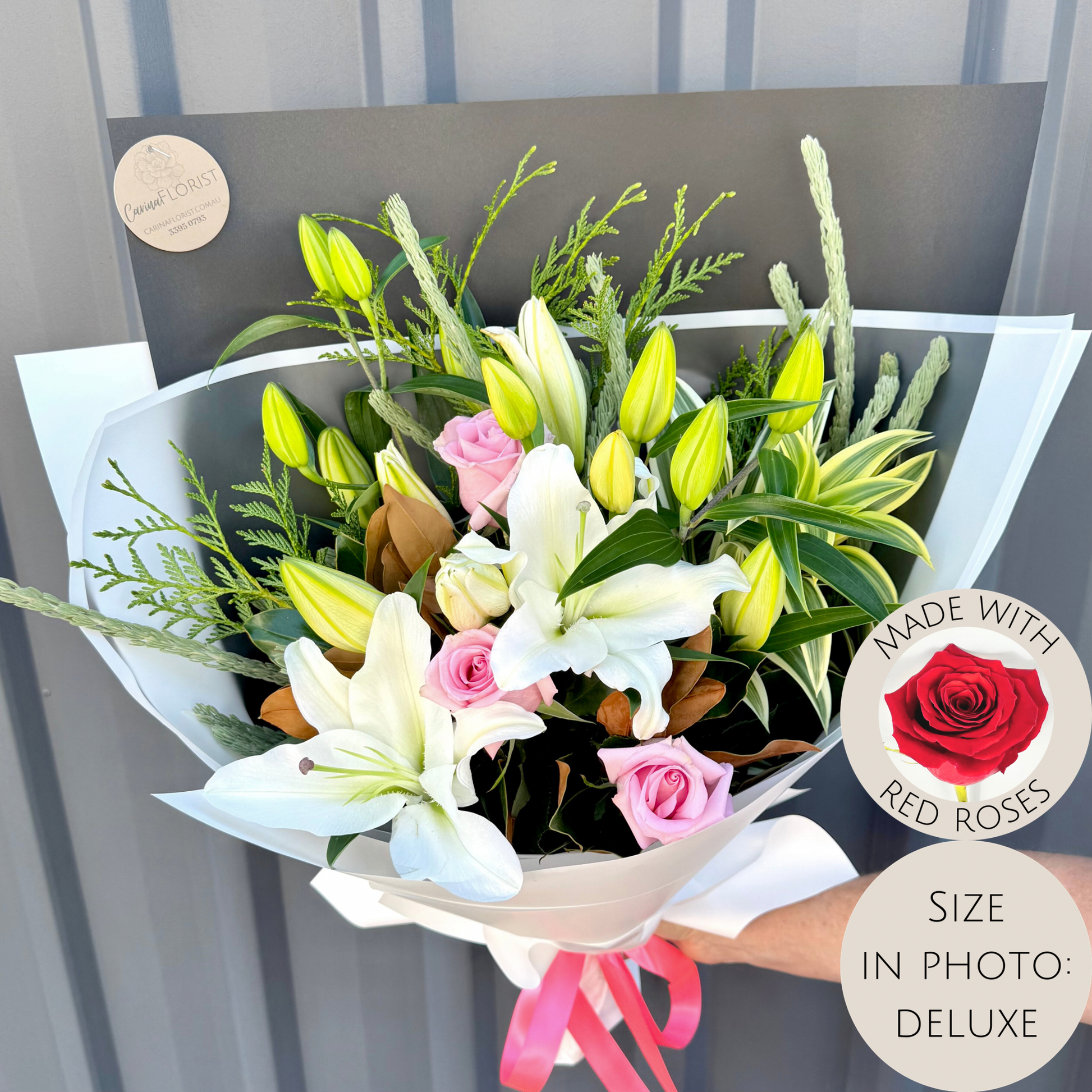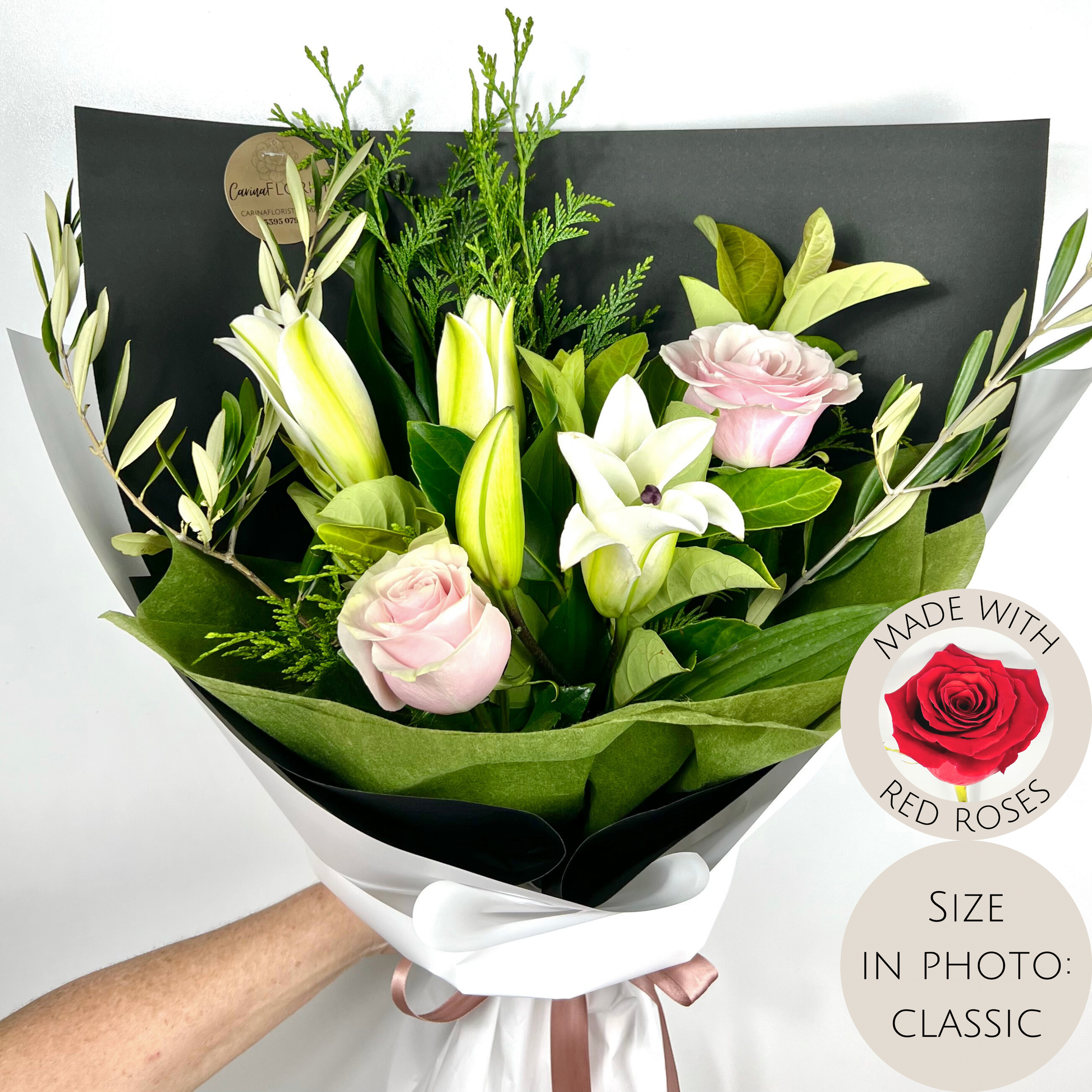 Please Note: This photo is a representation of how lilies will look partially open This arrangement will be made with the lilies at varying stages from bud-form to fully-open. The colour shades of the lilies and roses may also vary depending on variety.