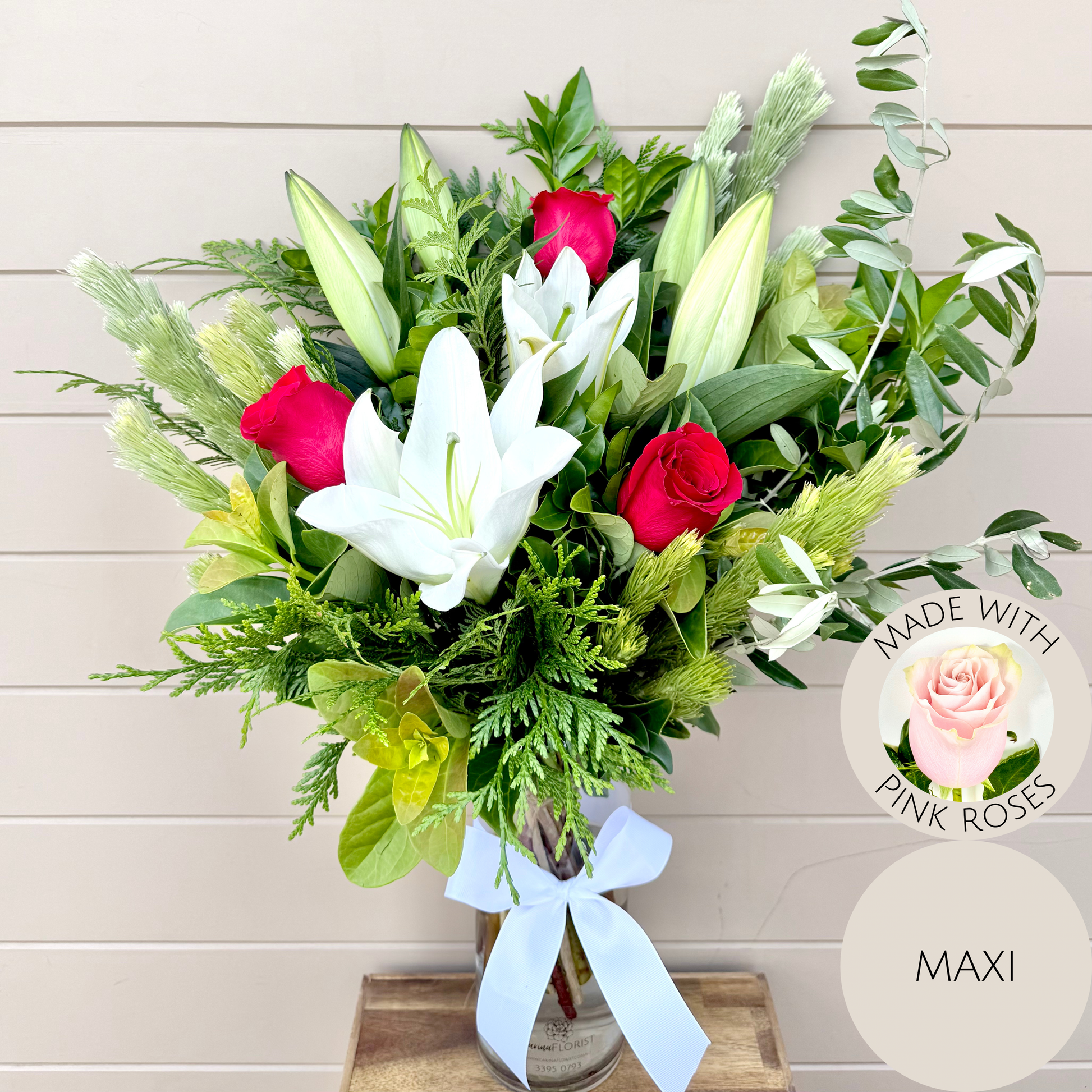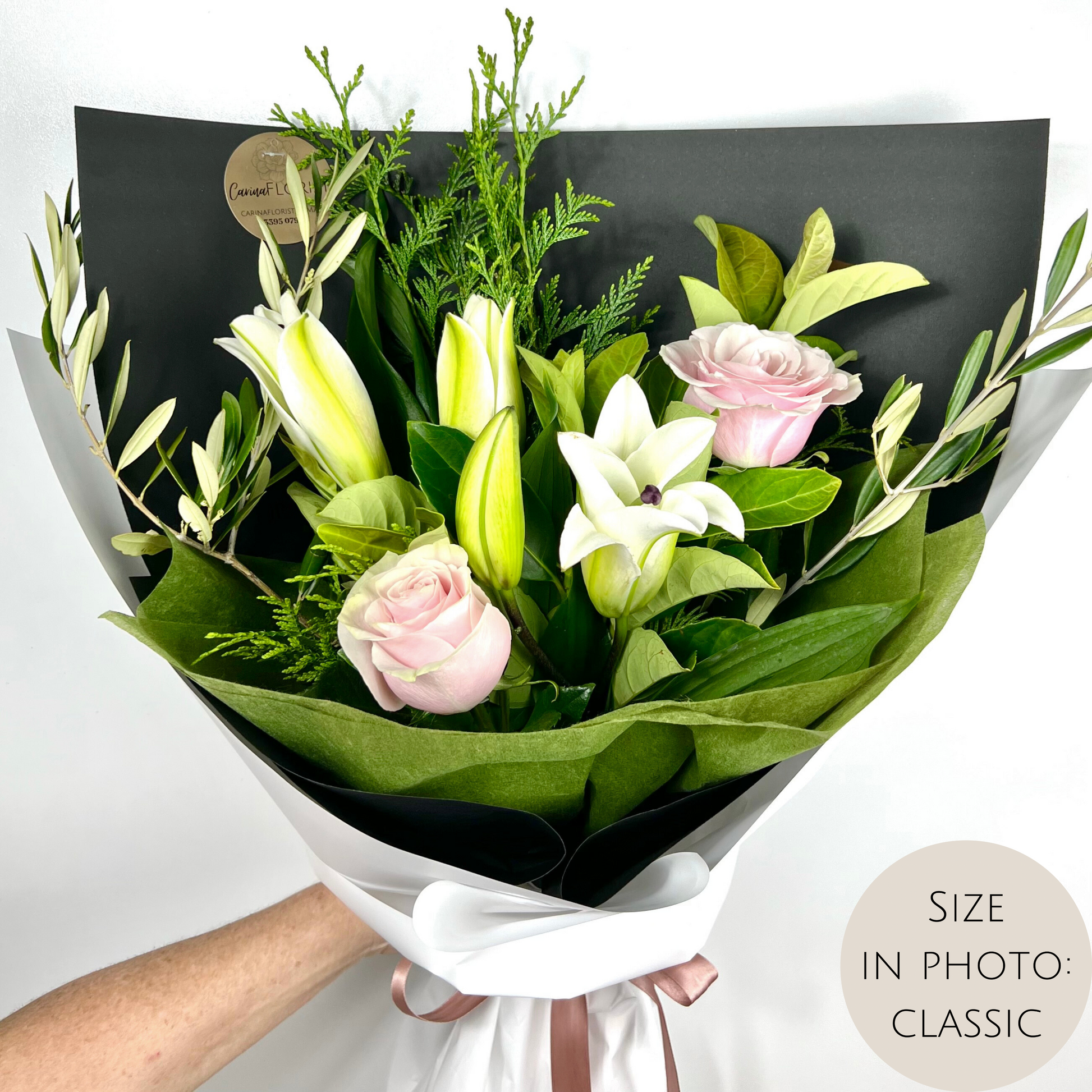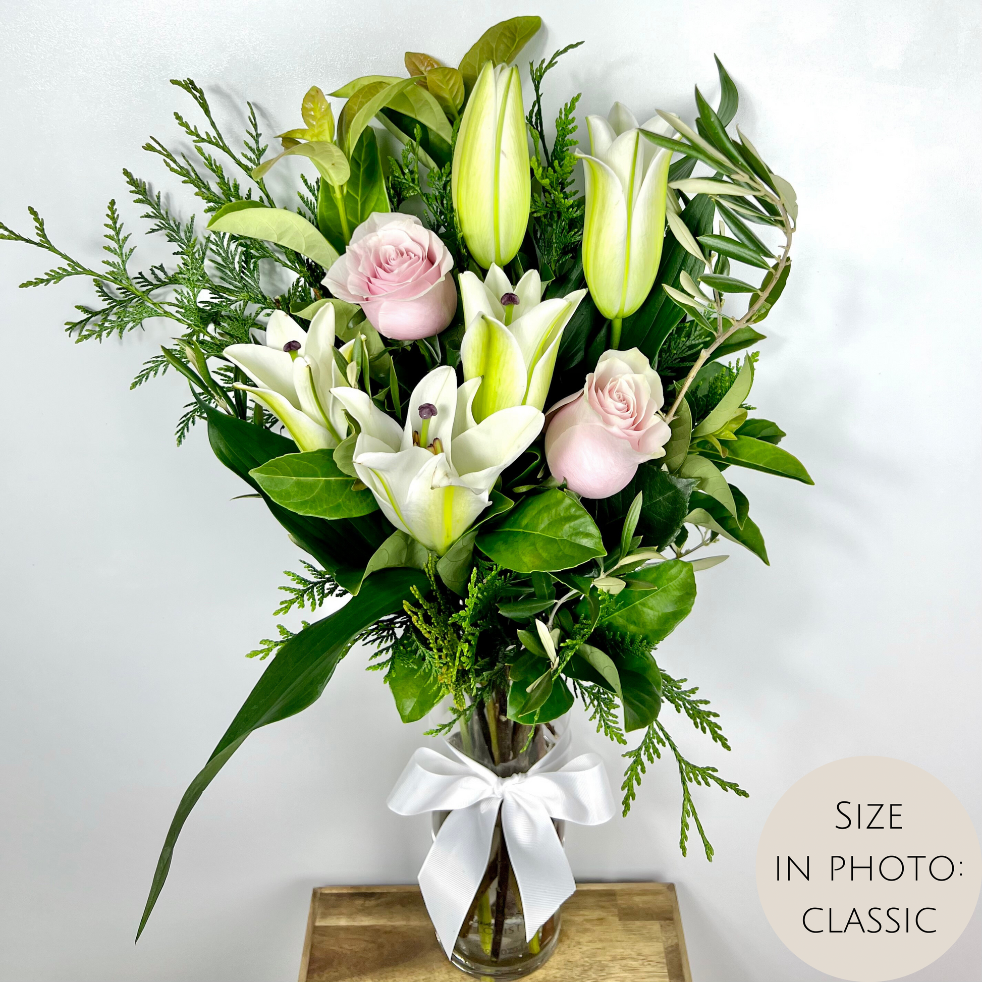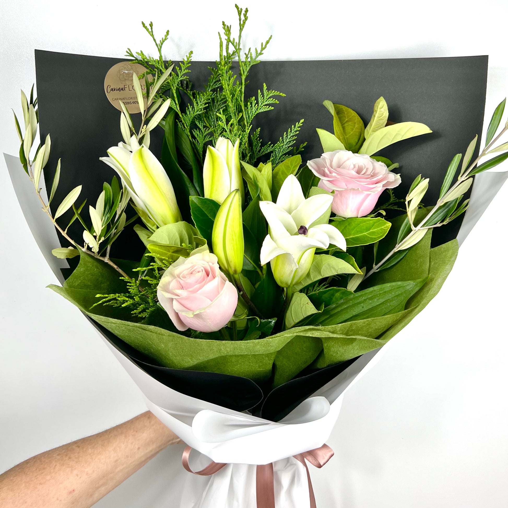 Please Note: This photo is a representation of how lilies will look partially open This arrangement will be made with the lilies at varying stages from bud-form to fully-open. The colour shades of the lilies and roses may also vary depending on variety.